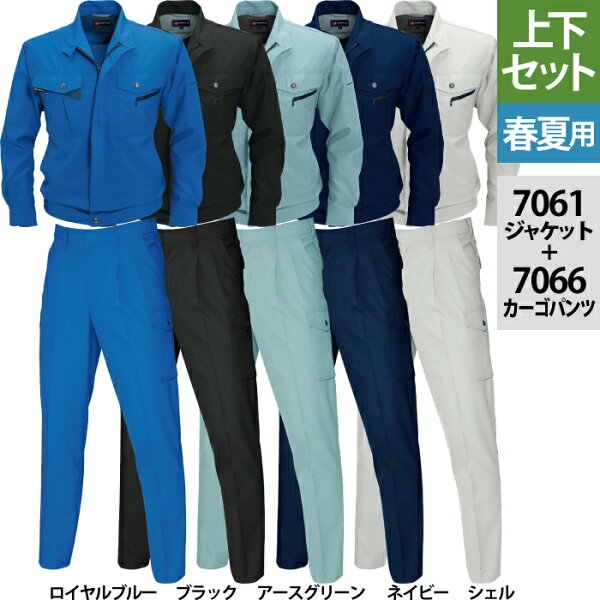 商品説明7061 長袖ブルゾン●春夏用●制電素材、形態安定性、吸汗・速乾、防汚加工、グリーン系●ソフトトロピカル、制電、超吸水速乾、防汚加工●素材:ポリエステル80%・綿20%●サイズ:S〜XL●カラー:アースグリーン、シェル、ネイビー、ブラック、ロイヤルブルー●ボディクーラー(胴脇両サイド部メッシュ仕様)、携帯電話収納ポケット(右胸)、内ポケット(左)、背アームノーフォーク、袖アームタック、V字型メッシュ背当て、袖ペンポケット(左)7066 ツータックカーゴパンツ●春夏用●制電素材、形態安定性、吸汗・速乾、防汚加工、グリーン系●ソフトトロピカル、制電、超吸水速乾、防汚加工●素材:ポリエステル80%・綿20%●サイズ:70〜100●カラー:アースグリーン、シェル、ネイビー、ブラック、ロイヤルブルー●ツインループ、ピスフラップ(マジックテープ止め)、携帯電話収納ポケット(右)商品仕様7061 長袖ブルゾン●さらに快適、スタイリッシュ、夏の定番品をアップグレード。